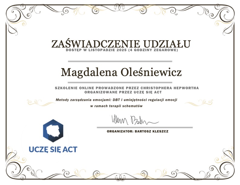 Z pasji i wykształcenia jestem psychologiem i certyfikowaną psychoterapeutką poznawczo-behawioralną (certyfikat nr 1164)oraz certyfikowaną psychoterapeutką schematu (certyfikat nr IND-3560).