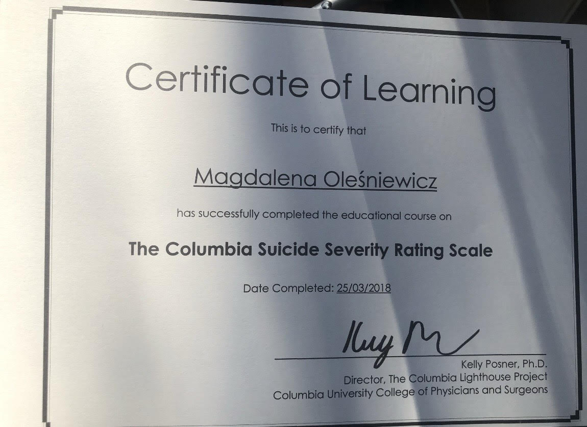 - Czteroletnie Szkolenie z Psychoterapii Poznawczo-Behawioralnej Centrum CBT-EDU w Warszawie (posiadająca rekomendację Polskiego Towarzystwa Terapii Poznawczej i Behawioralnej, które jest członkiem European Association for Behavioural and Cognitive Therapies)